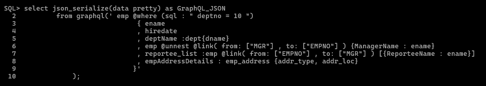 from graphql(' emp @where (sql : " deptno = 10 ")