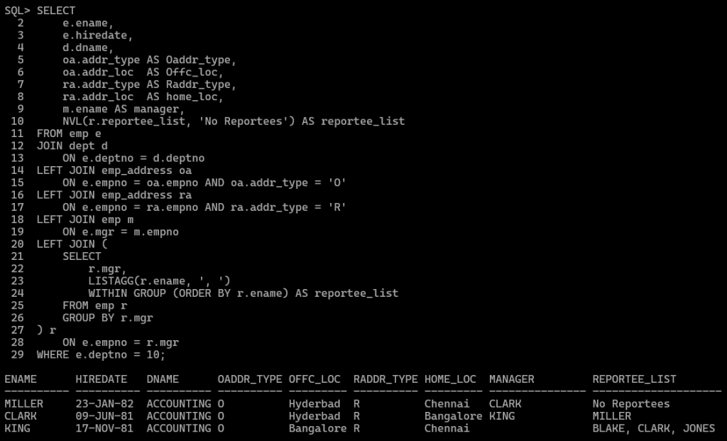 - aggregated subquery (LISTAGG) to fetch reportees