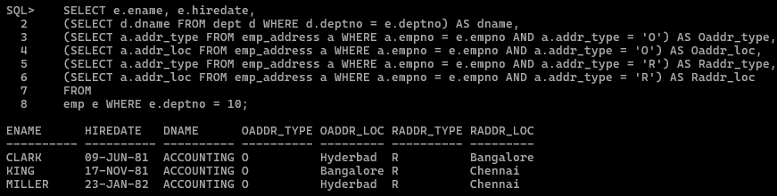 WHERE a.empno = e.empno AND a.addr_type = 'O') AS Oaddr_type,
