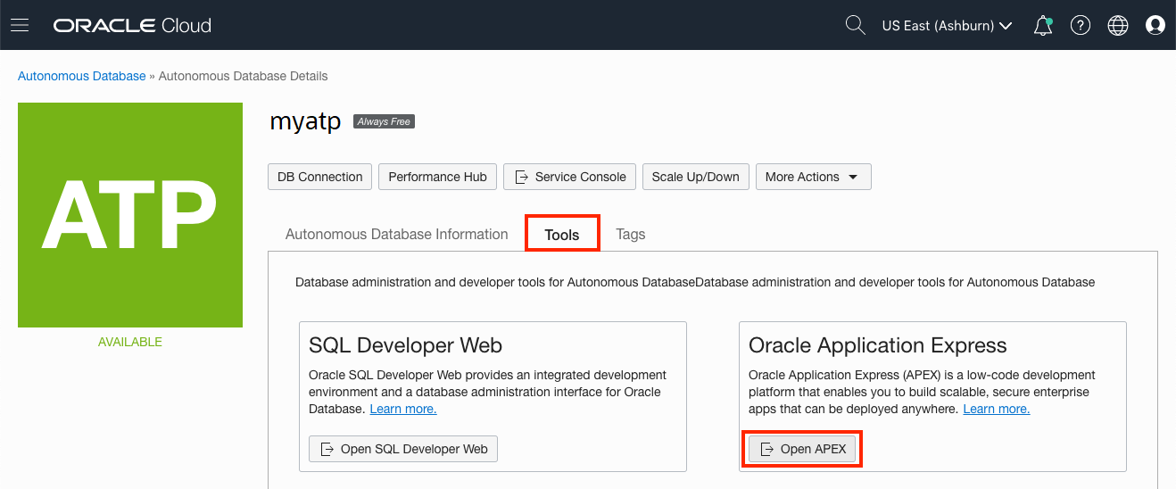 Let’s jump in specifically with APEX. In the details screen of your database, click the Tools tab. Notice a prominent box that says Oracle Application Express. Click Open APEX in this box, which opens APEX in a new browser tab. You might need to wait an extra minute for APEX to finish opening the very first time (subsequent loads are faster).