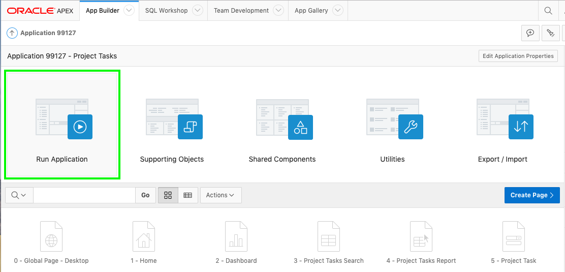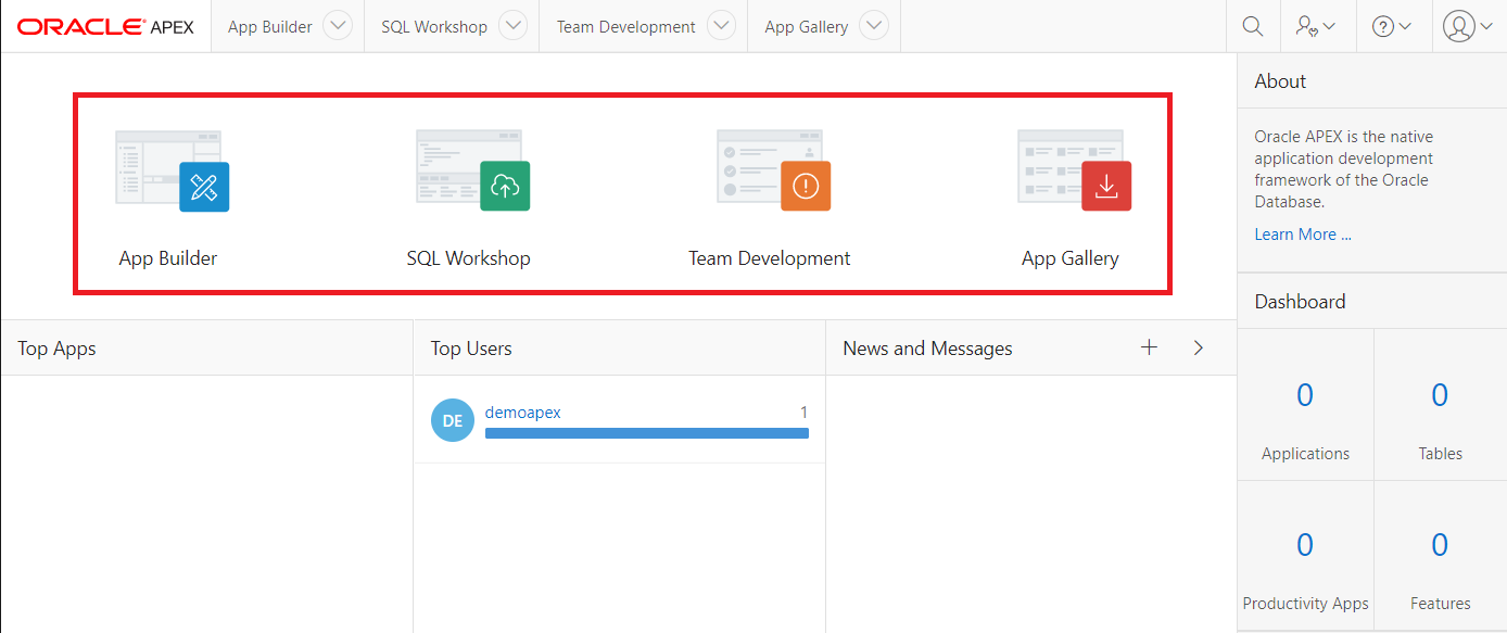 We now see the APEX Workspace homepage. It gives you easy access to the four main areas of APEX: App Builder, SQL Workshop, Team Development, and App Gallery. App Builder is where you go to create and edit APEX apps. SQL Workshop provides a full database object explorer plus an interface to run SQL queries and see query results. Team Development gives you access to the rich collaborative development features of APEX. App Gallery includes a suite of predefined productivity applications you can install and use. For this tutorial, we will work mainly in App Builder.