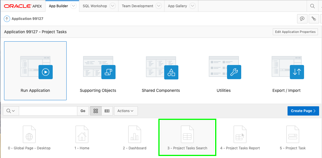 Alternatively, you can also navigate back to App Builder in your browser manually by selecting the appropriate browser tab or window. Once you are in App Builder, click the page 3 – Project Tasks Search.