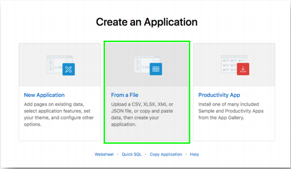 When creating an application from a file, APEX allows you to upload CSV, XLSX, XML, or JSON files and then build the app based on this data. Alternatively, you can also copy and paste CSV data or use sample data sets that are included with APEX.