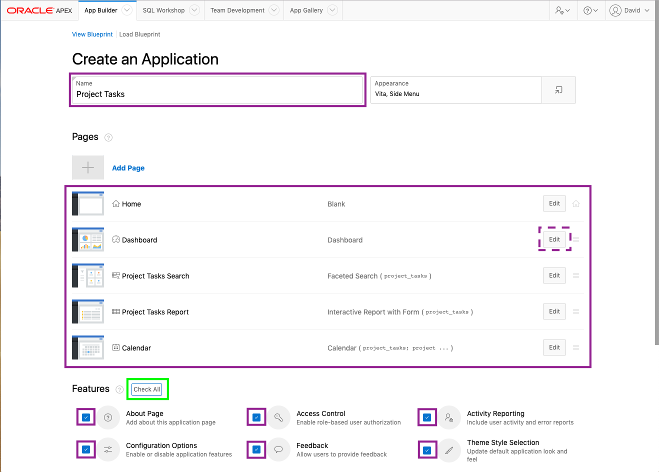 In the Create Application page, review the new app pages that will be generated. Click the Edit button for a given page if you want to review details about it.