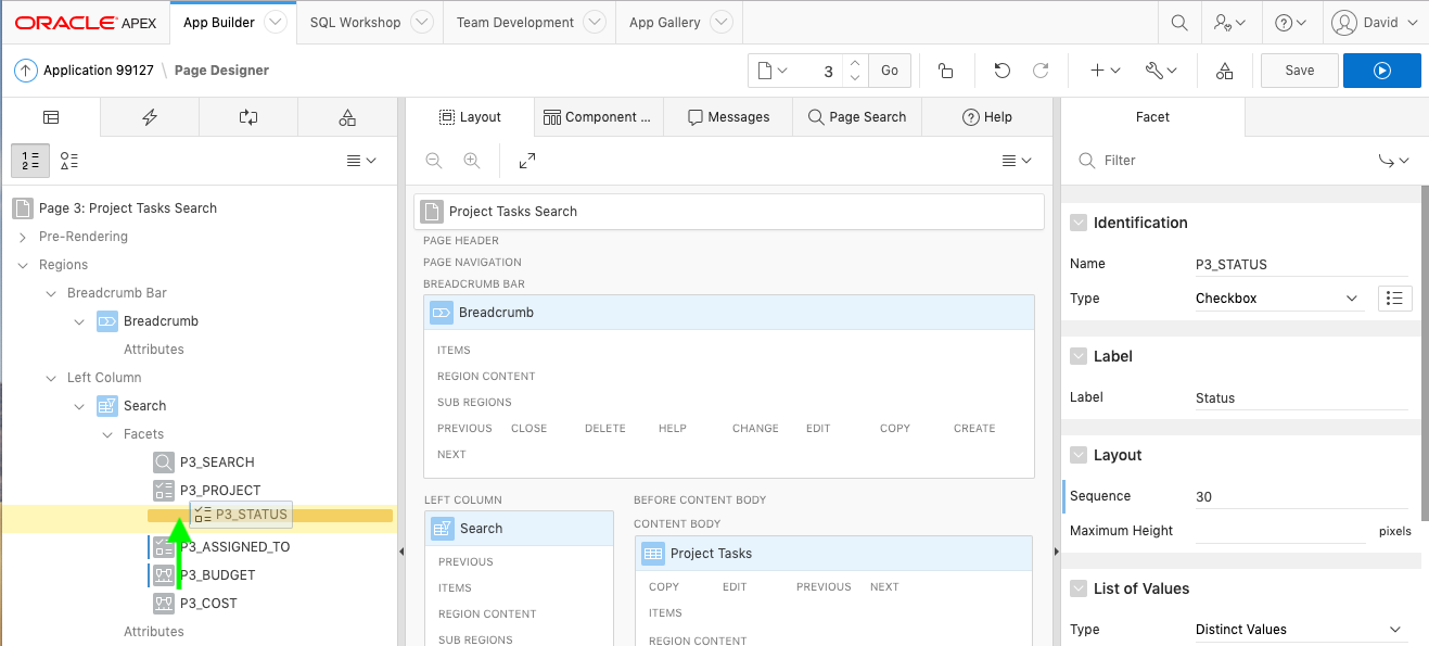In the Rendering Tree (left pane), under Search, within Facets, click and hold P3_STATUS. Drag it up until it is immediately under P3_PROJECT, then release the mouse.