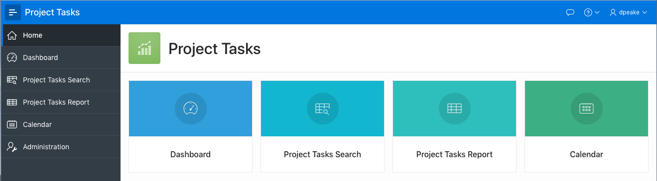 Explore the application a little. Click Dashboard (in the home menu or navigation menu) to view charts that were created. Click Project Tasks Search (in the navigation menu) to experiment with faceted searches. Click Project Tasks Report to view an interactive report, then click the Edit icon for a given record to display details in an editable form. Next, navigate to the Calendar page and review the data displayed (you may need to scroll back a few months to see data). Finally, review the options available under Administration.