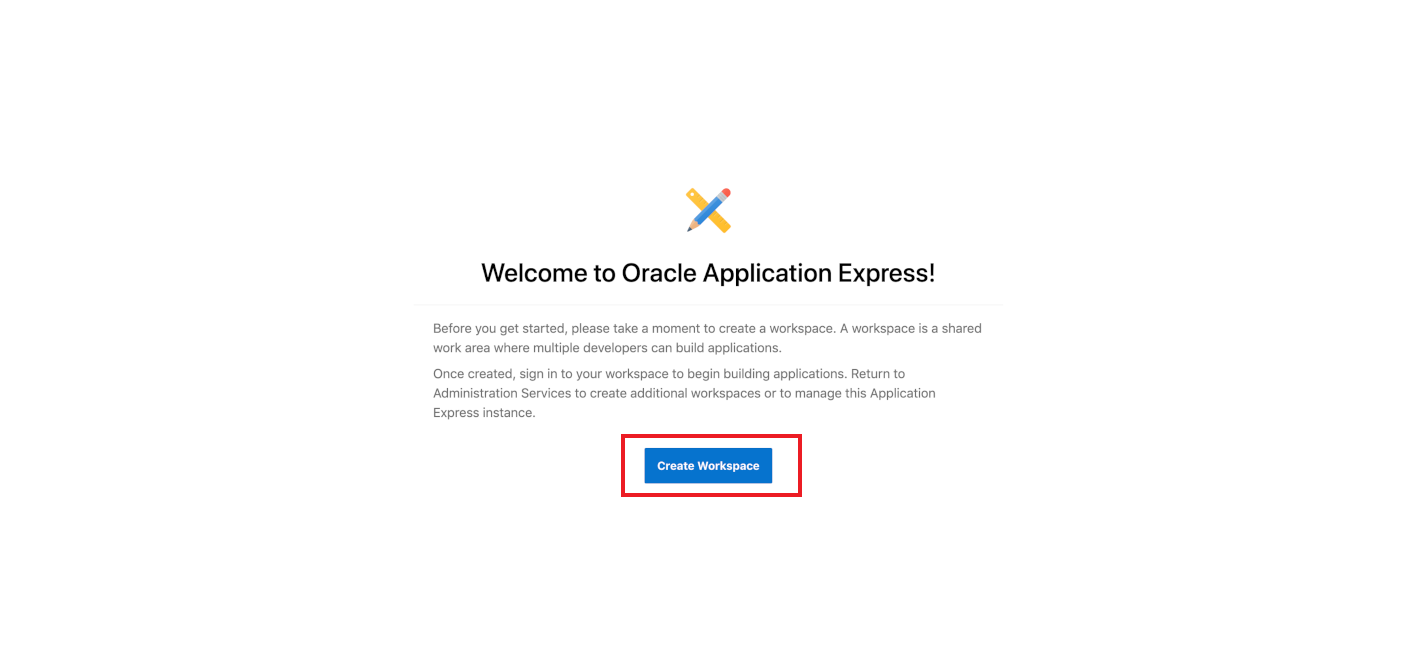 Soon you will see an APEX Administration Services welcome screen that looks like the one below. Review the message text, and click the button to proceed.