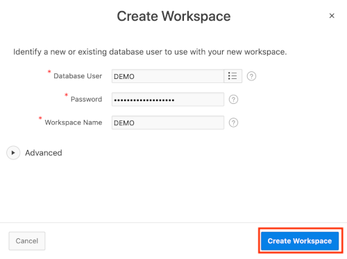 For our example, enter DEMO as the database user name and workspace name. Make sure to remember your password. Click the Create Workspace button to continue.