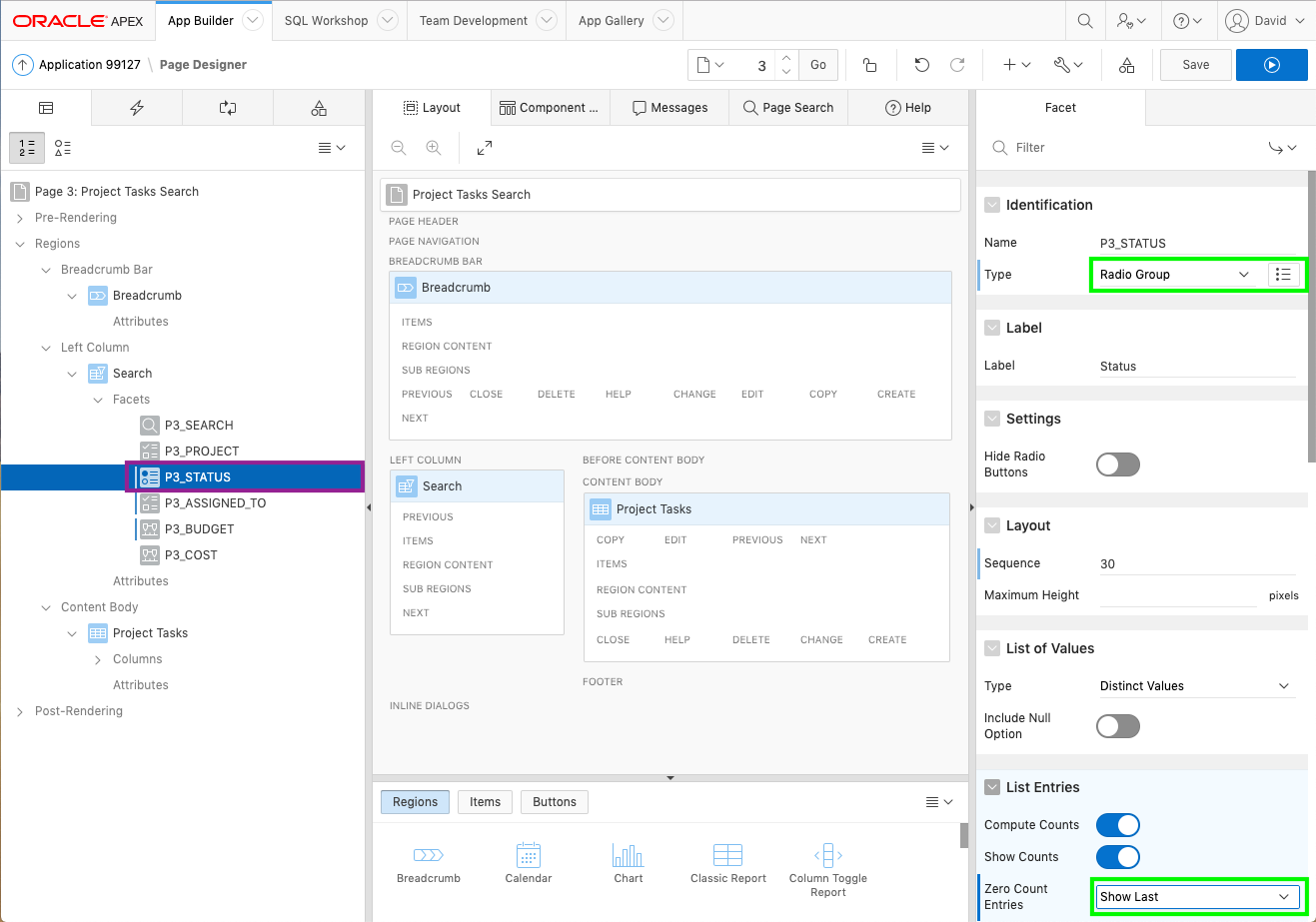 Continuing with P3_STATUS selected, within the Property Editor (right pane), for Identification > Type, select Radio Group. Scroll down the properties in Property Editor, and for List Entries > Zero Count Entries, select Show Last.