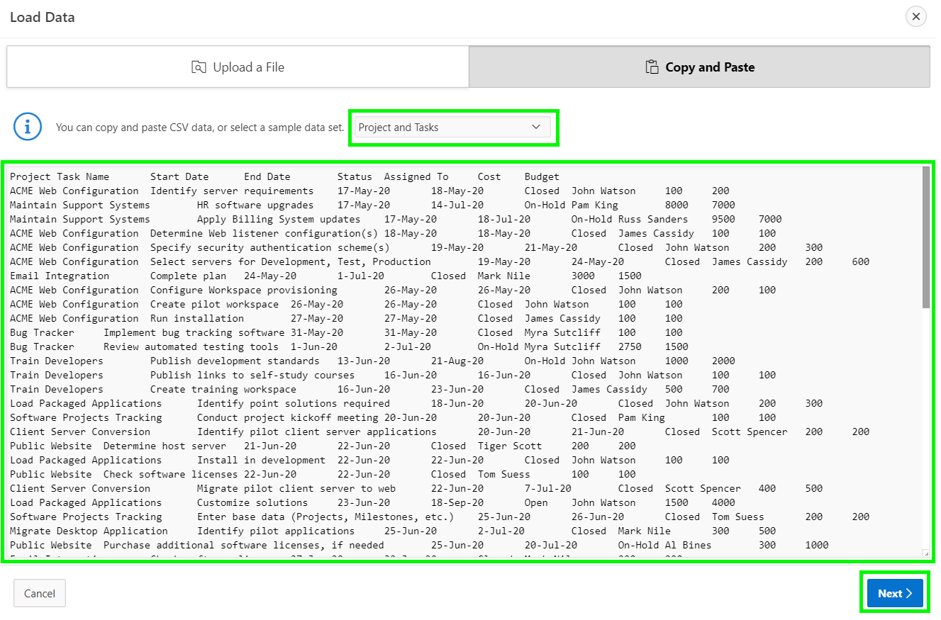 Click the dropdown box that shows a list of sample data sets, and select Project and Tasks. Notice a sample data set is automatically pasted for you into the text area below. From here, you can simply click Next.