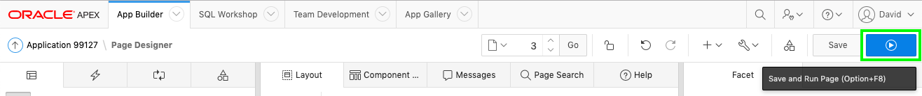 You should now be in APEX Page Designer. This is where you will spend the majority of your time improving the application. There are three panes within Page Designer. The left pane displays a hierarchical list of page components called the Rendering Tree. The middle pane displays page Layout (a high-level representation of the rendered page) and Gallery (from which you can drag and drop app components into the Layout). The right pane is the Property Editor, where you can change attributes for a selected component.