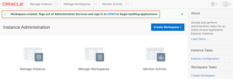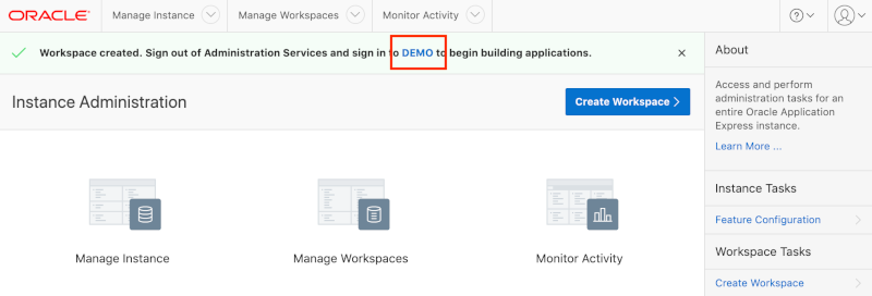 Now we are going to sign out of APEX Administration Services and go to the sign-in page for APEX workspaces. In the message at the top of your screen, notice it contains a link with the name of your new APEX workspace (in our example, DEMO). Click this link to continue.