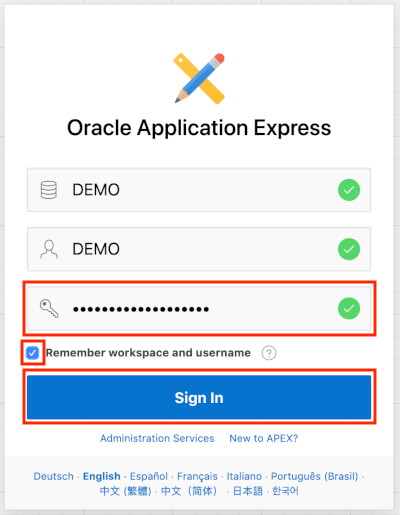 Bookmark this page in your browser so you have an easy way to sign into your APEX workspace in the future with a single click. The bookmark should looks something like this: