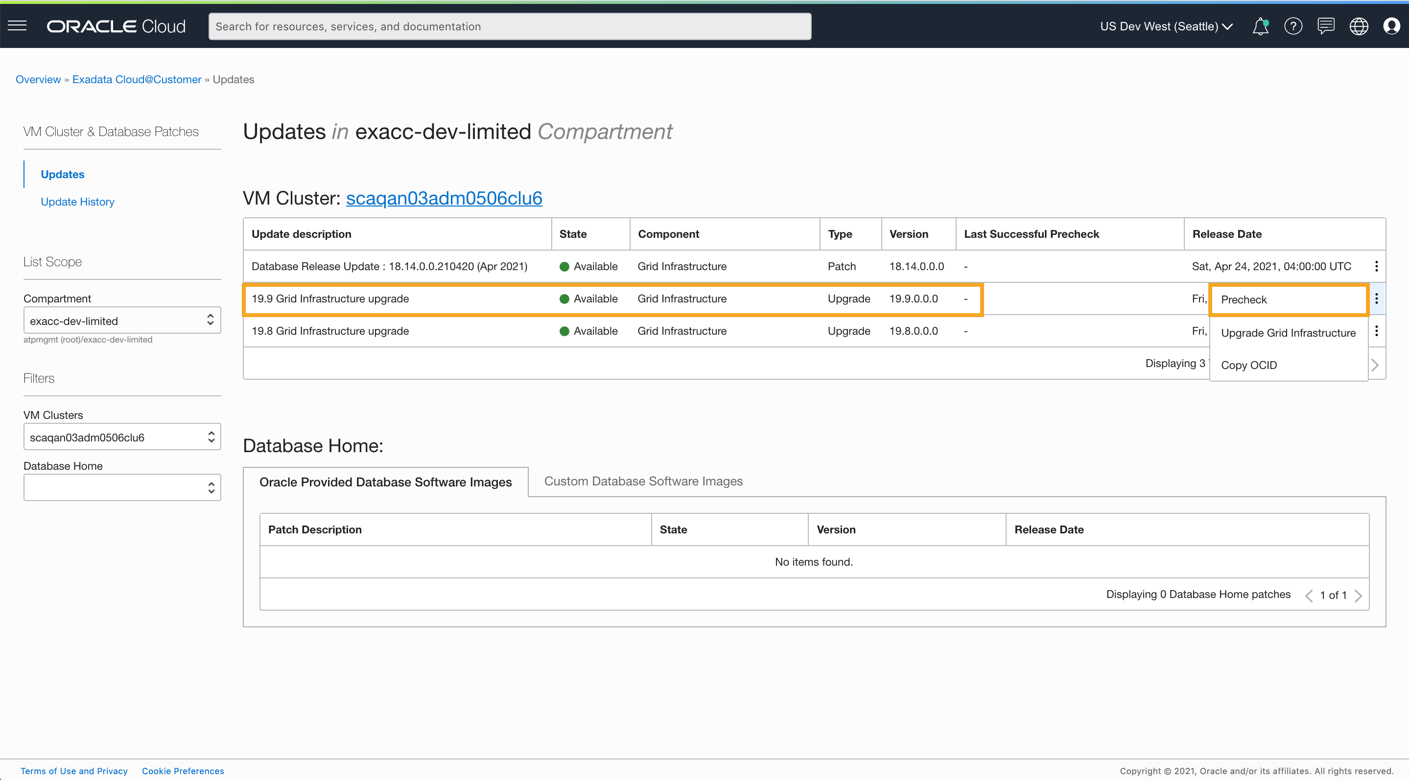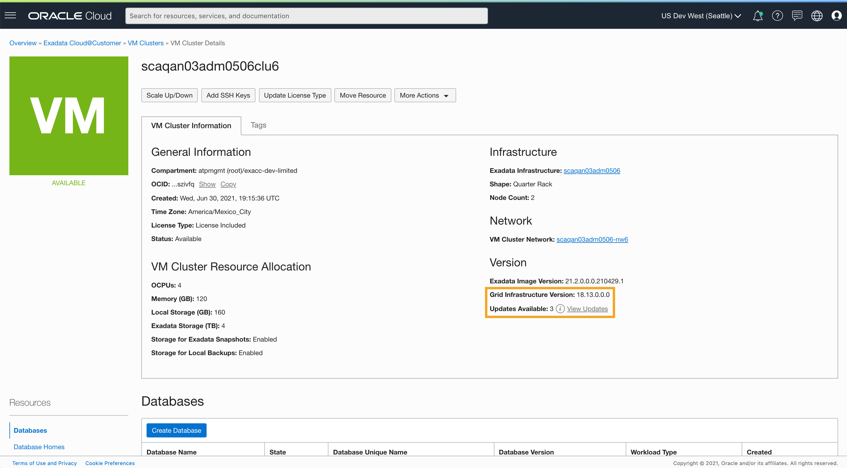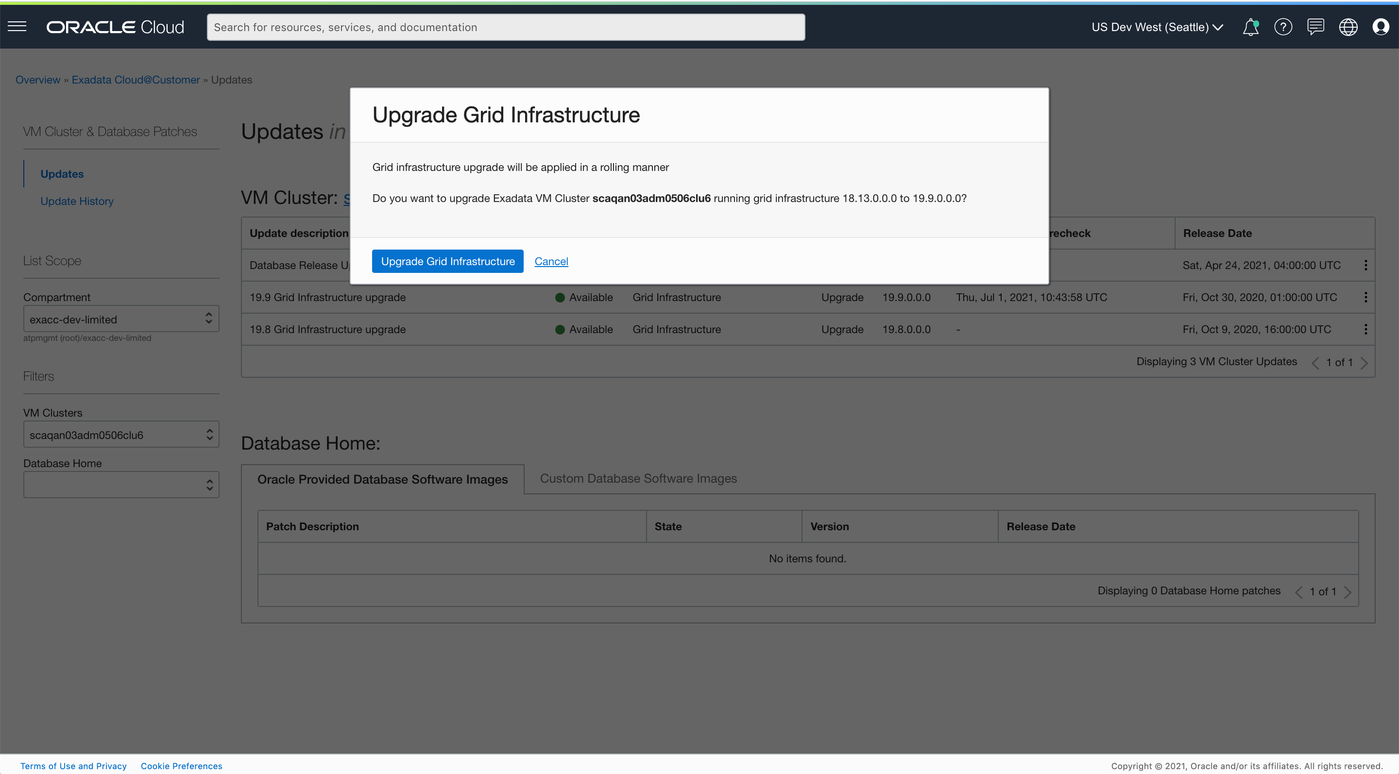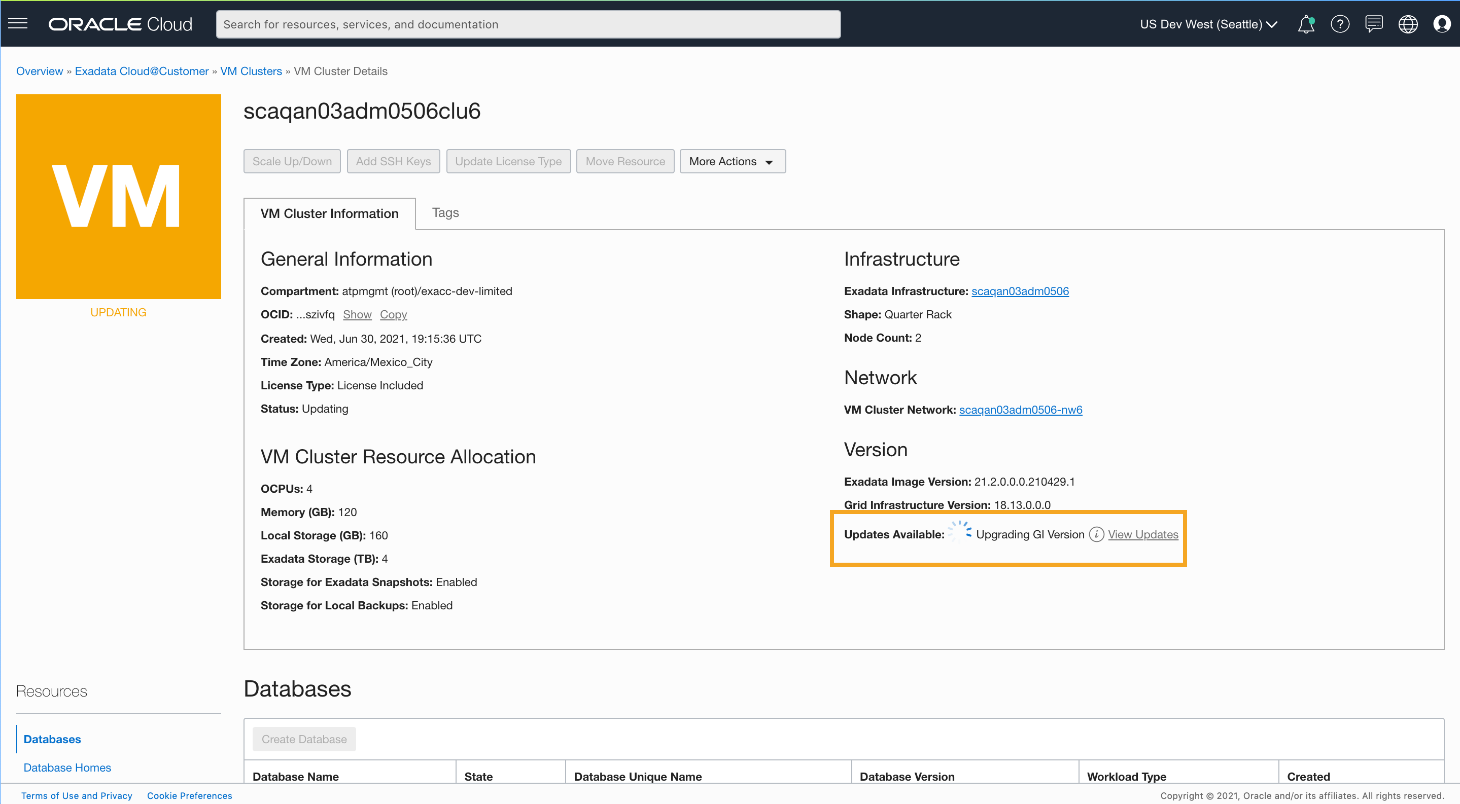 All VM Clusters running older GI versions will now have an upgrade option to apply the 19c GI version. This GI version upgrade option is part of the software updates available on the VM cluster.