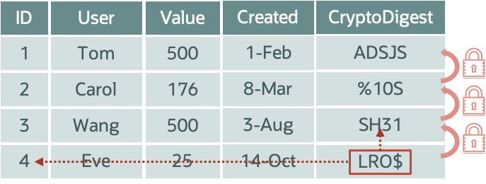 To protect against illicit changes made by hackers, Oracle has introduced Blockchain tables. Blockchain tables are immutable tables that organize rows into several chains. Each row, except the first row in the chain, is chained to the previous row via a cryptographic digest or hash. The hash is automatically calculated on insert based on that row’s data and the hash value of the previous row in the chain. Timestamps are also recorded for each row on insertion.