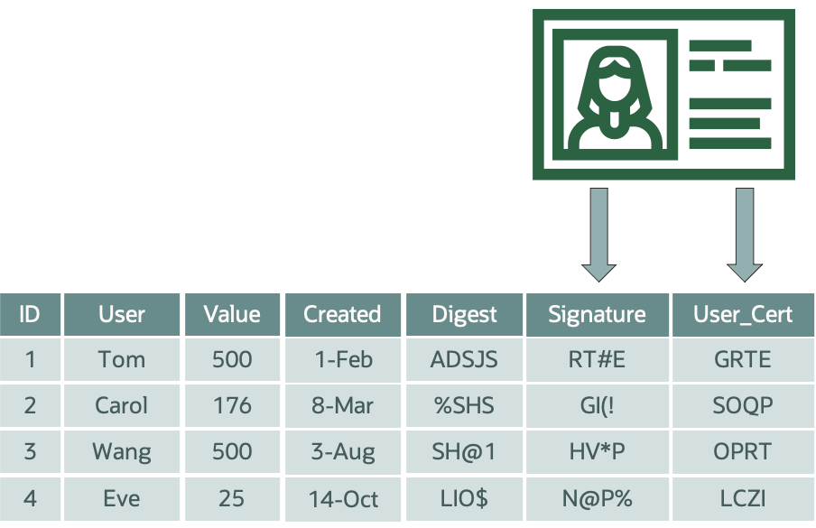 Even with Immutable or Blockchain tables, data can be falsely inserted in an end user’s name by someone using stolen credentials. To address this vulnerability, Oracle allows end-users to cryptographically sign the data they insert using their private key that is never passed to the database. Each end-user registers a digital certificate containing their public key with this database. This digital certificate allows the database to validate the end-users signature when new data is inserted. Even if a hacker manages to steal a valid set of credentials without the private key, the signature on the newly inserted data won’t match and will therefore not be accepted.