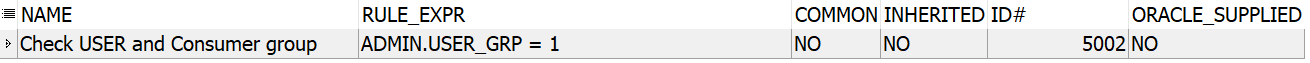 | BEGIN DVSYS.DBMS_MACADM.CREATE_RULE( rule_name => ‘Check USER and Consumer group’, rule_expr =>’ADMIN.USER_GRP_FN = 1′); END; / |