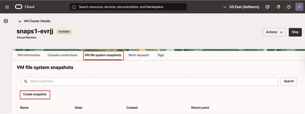 Before making any change, capture the current VM file system state. In the OCI Cloud console (shown below), navigate to your ExaDB-XS VM Cluster detail page and create a snapshot. You can provide a meaningful name for your snapshot (for example, “baseline20260406”) to easily identify it later. You can also use the OCI API for automation.