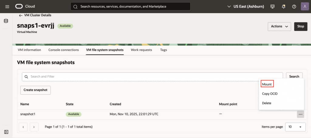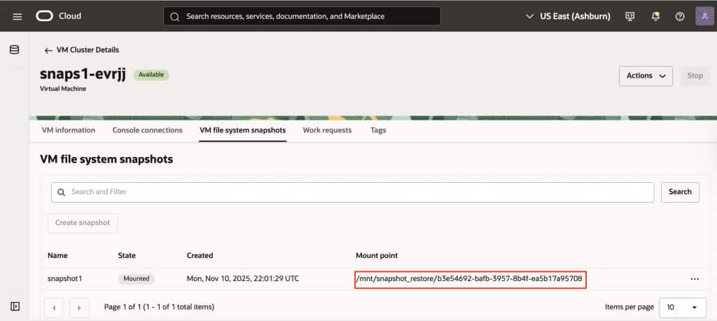 When you mount a snapshot on the VM, the mount point will be displayed on the console, allowing you to access the historical file system containing your boot volume, Oracle home binaries, and configuration files.