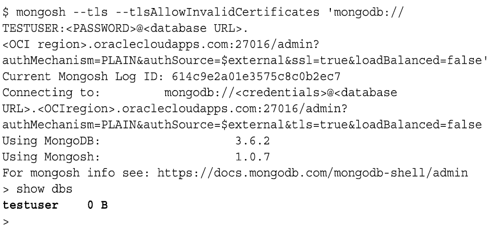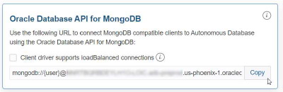 Use MongoDB Shell, a command-line utility to connect and query data in Autonomous JSON Database. We recommend v3.6 or later. For applications built using popular languages such as Java, Node, .NET and Python, we recommend Java driver 3.6 or later, Node.js 3.0 or later, .NET 2.5 or later, Python 3.6 or later with load_balanced, parameter set as ‘true’.