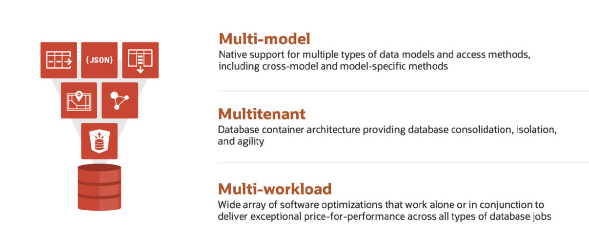 Oracle’s converged database has built-in support for all modern data types and the latest development paradigms. Converged databases support spatial data for location awareness, JSON for document stores, IoT for device integration, in-memory technologies for real-time analytics, and of course, traditional relational data. By providing support for various data types, a converged database can run all sorts of workloads from IoT to Blockchain to Analytics and Machine Learning. It can also handle various development paradigms, including Microservices, Events, REST, SaaS, and CI/CD eliminating data replication or duplication, reducing the cost and increasing developer productivity.