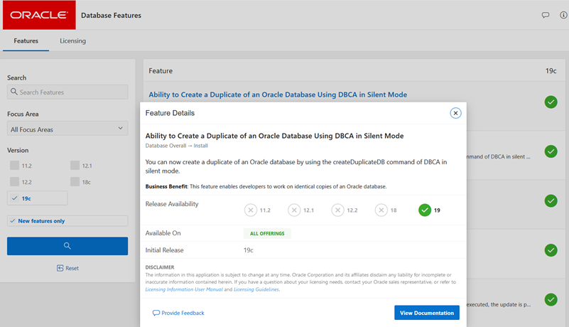 Want to see only the latest features? Sure! Select 19c and then click the New features only selector. Now you’ll see all of the features that were introduced in the latest release, Oracle Database 19c. And, if you want to isolate what is just in Oracle Database 19c, then select the 19c version selector. It couldn’t be easier!