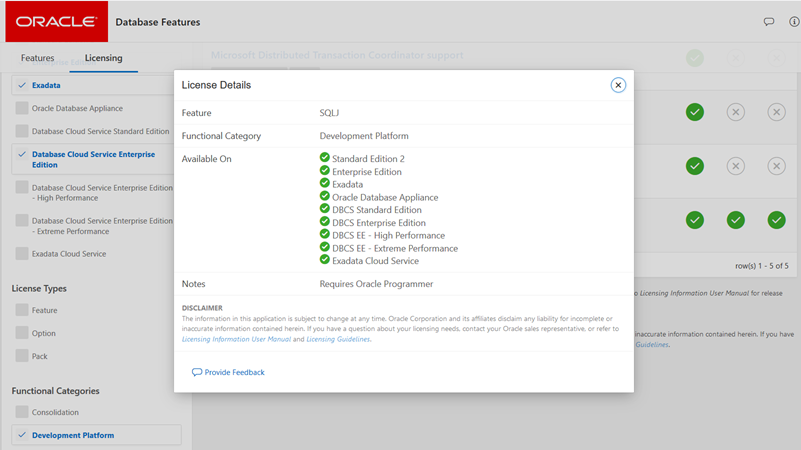 And same as the Features tab, selecting a feature displays a modal window with detailed information about the functional category, availability across Oracle Database offerings, and notes about the feature.