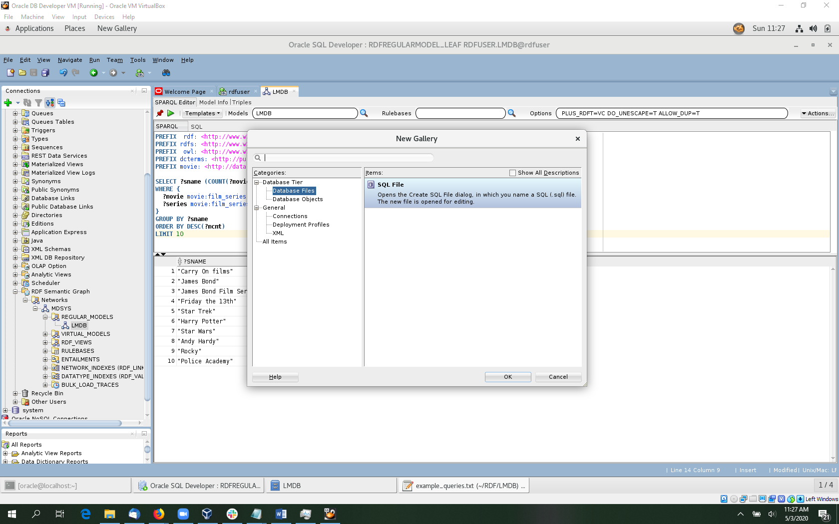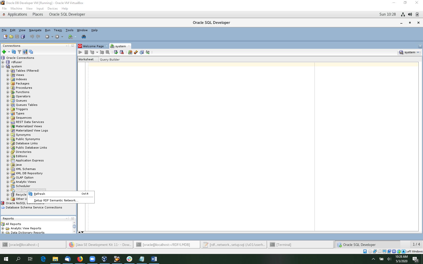 [oracle@localhost ~]$ cd /usr/ [oracle@localhost usr]$ sudo mkdir dbs [sudo] password for oracle: [oracle@localhost usr]$ ls -l total 4 dr-xr-xr-x. 1 root root 31422 May 31 2019 bin drwxr-xr-x. 1 root root 0 May 1 15:01 dbs drwxr-xr-x. 1 root root 0 Apr 10 2018 etc drwxr-xr-x. 1 root root 0 Apr 10 2018 games drwxr-xr-x. 1 root root 2626 May 31 2019 include dr-xr-xr-x. 1 root root 4488 May 31 2019 lib dr-xr-xr-x. 1 root root 76110 May 31 2019 lib64 drwxr-xr-x. 1 root root 8672 May 31 2019 libexec drwxr-xr-x. 1 root root 90 Apr 10 2018 local dr-xr-xr-x. 1 root root 12296 May 1 09:48 sbin drwxr-xr-x. 1 root root 4080 May 31 2019 share drwxr-xr-x. 1 root root 24 May 31 2019 src lrwxrwxrwx. 1 root root 10 May 31 2019 tmp -> ../var/tmp [oracle@localhost usr]$ sudo chown oracle dbs [oracle@localhost usr]$ ls -l total 4 dr-xr-xr-x. 1 root root 31422 May 31 2019 bin drwxr-xr-x. 1 oracle root 0 May 1 15:01 dbs drwxr-xr-x. 1 root root 0 Apr 10 2018 etc drwxr-xr-x. 1 root root 0 Apr 10 2018 games drwxr-xr-x. 1 root root 2626 May 31 2019 include dr-xr-xr-x. 1 root root 4488 May 31 2019 lib dr-xr-xr-x. 1 root root 76110 May 31 2019 lib64 drwxr-xr-x. 1 root root 8672 May 31 2019 libexec drwxr-xr-x. 1 root root 90 Apr 10 2018 local dr-xr-xr-x. 1 root root 12296 May 1 09:48 sbin drwxr-xr-x. 1 root root 4080 May 31 2019 share drwxr-xr-x. 1 root root 24 May 31 2019 src lrwxrwxrwx. 1 root root 10 May 31 2019 tmp -> ../var/tmp [oracle@localhost usr]$To use the RDF Knowledge Graph feature, we need to create a database user and an RDF network.