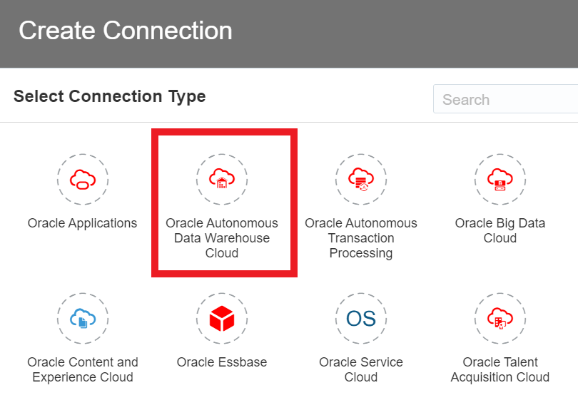- In the Create Connection Dialog, select the highlighted option for ‘Oracle Autonomous Data Warehouse’ and progress through the wizard.