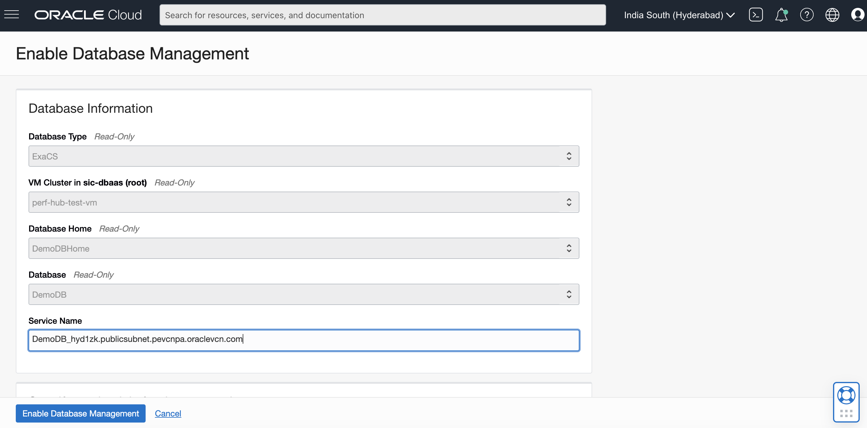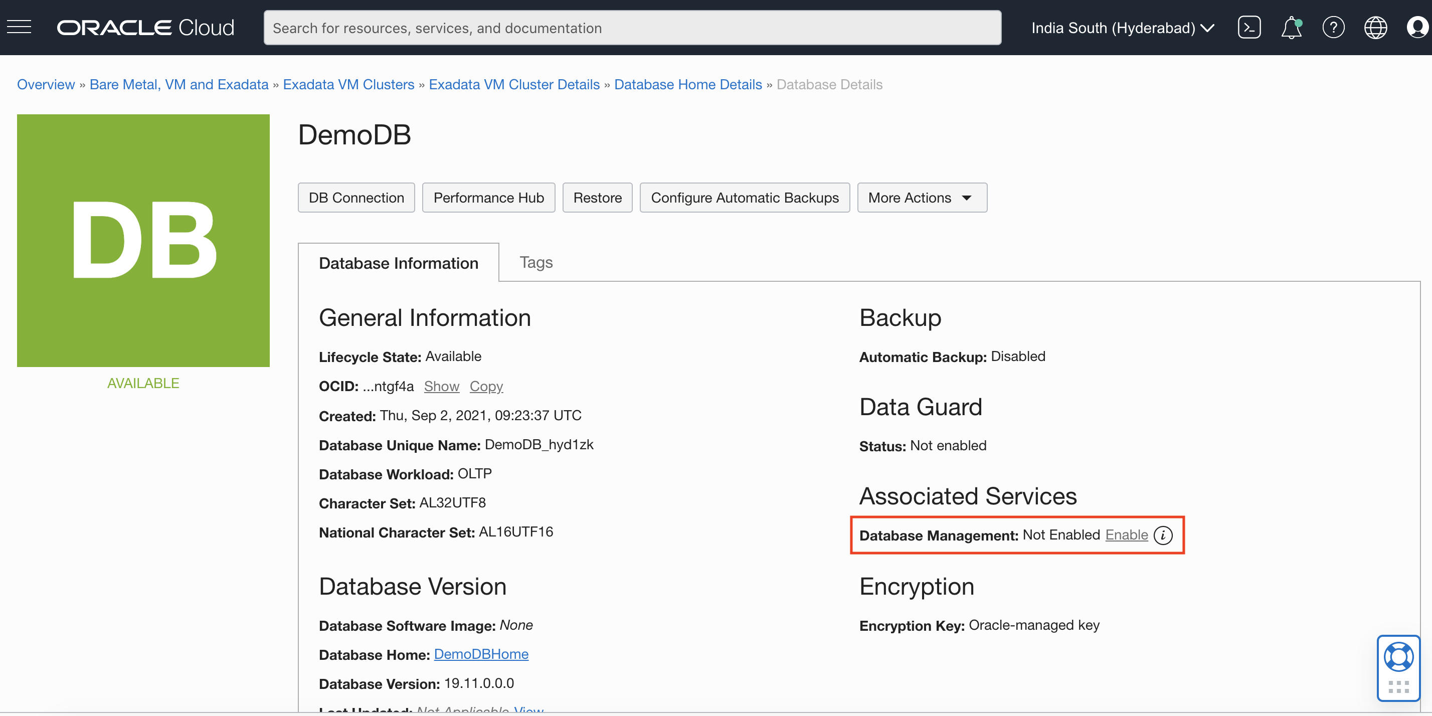 From the Bare Metal, VM, and Exadata service home page, navigate to Exadata VM Cluster → Database (for ExaCS) and navigate to DB Systems → Database (for DBCS). On the Database Details page, click ‘Enable’ for the label Database Management. Provide the details required and along with that choose between Full Management and Basic Management. There is an option to disable or edit the Database management option as well.