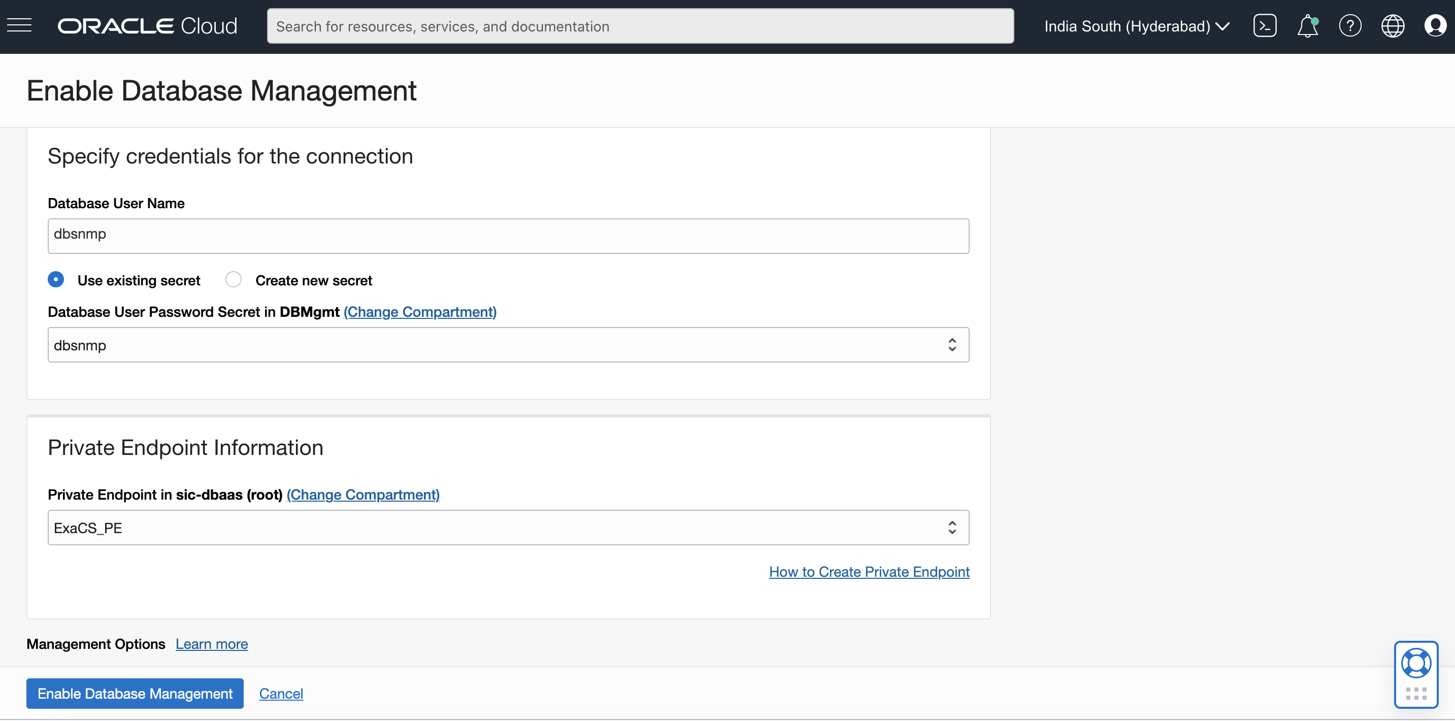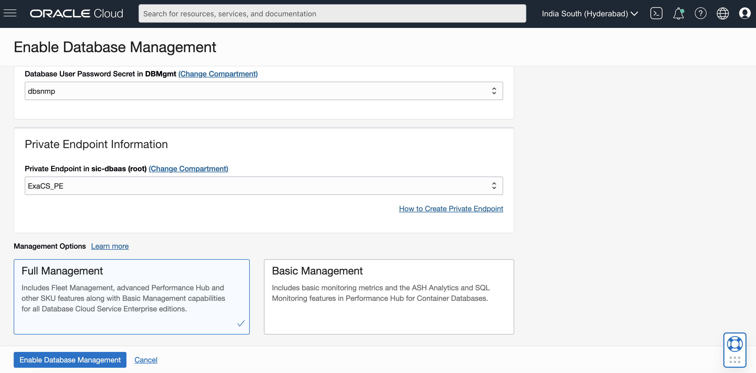 While enabling the Database Management, you will provide user credentials, private endpoint, and choose a management option. There are two management options to choose from: Basic Management and Full Management.