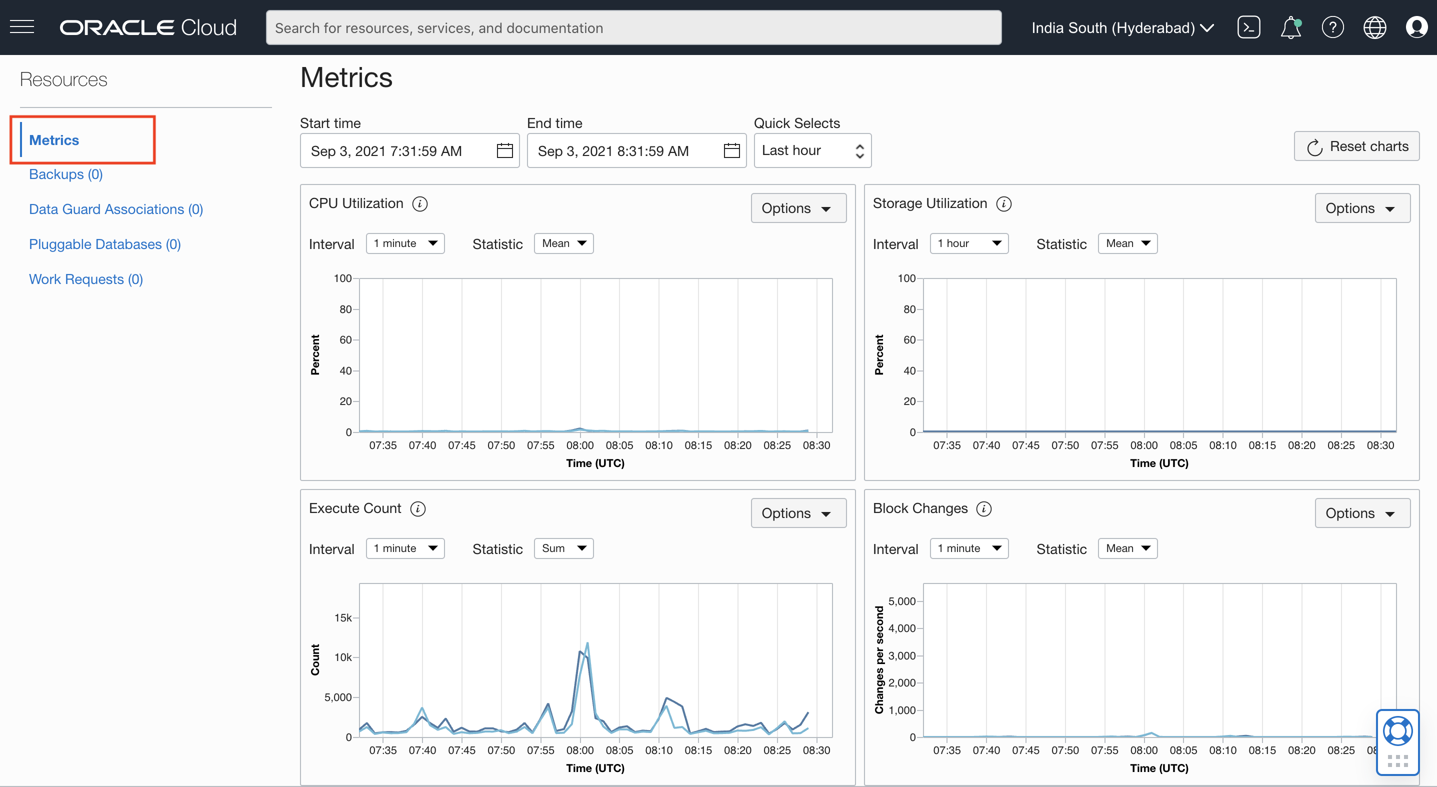 Once the Database Management is enabled, you can view database metrics by clicking on ‘Metrics’ under section ‘Resources’. On the database details page, you can view six of the database metrics: CPU Utilization, Storage Utilization, Execute Count, Block Changes, Parse Count (Total), Current Logons. The additional metrics can be viewed by going to the OCI Database Management service or OCI Monitoring Service.