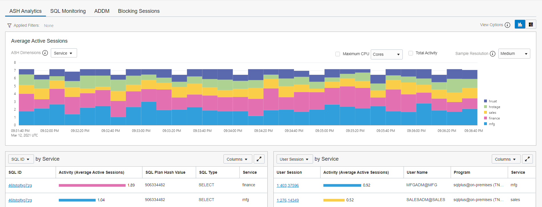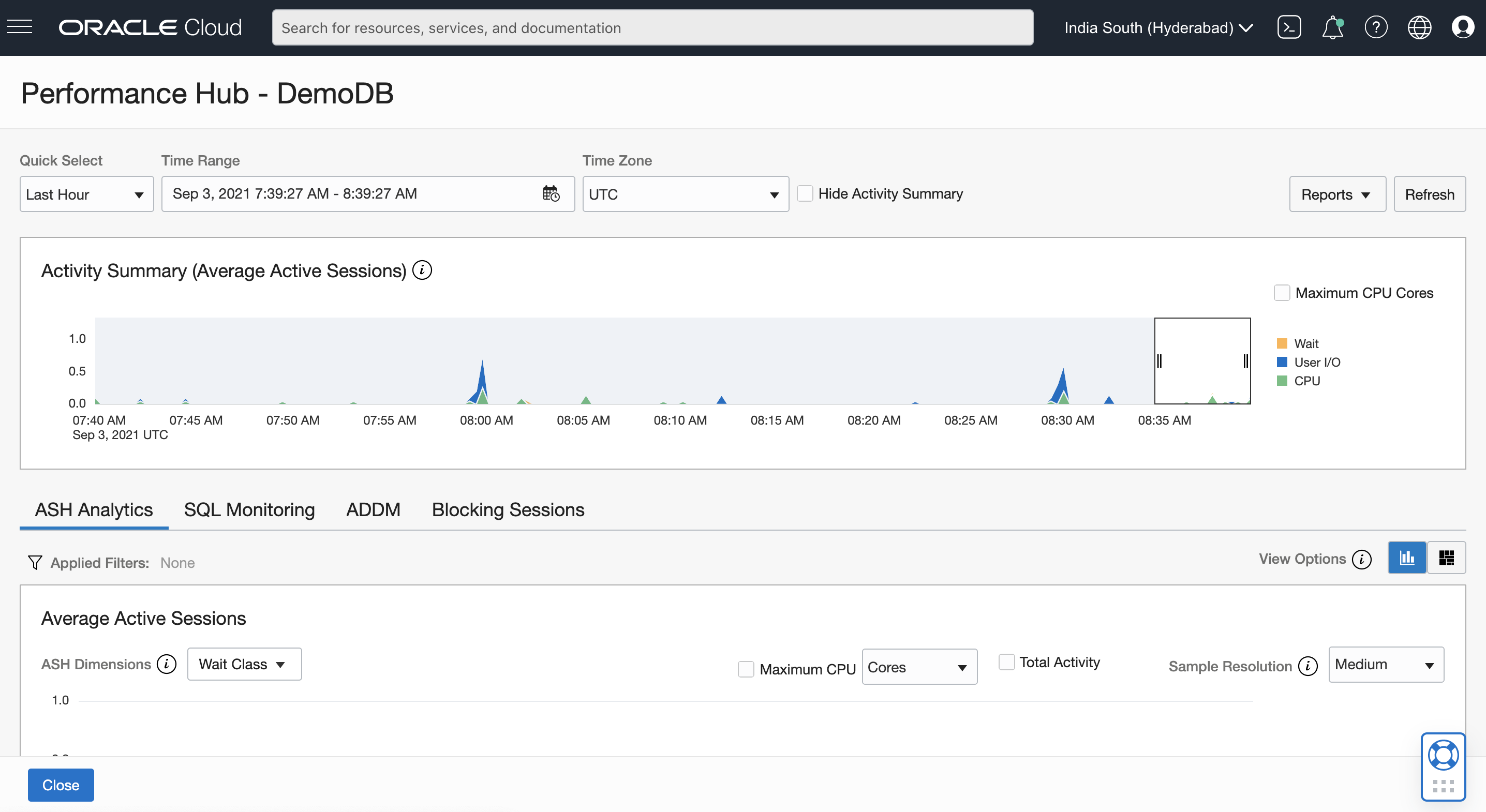 Once the Database Management is enabled, you can click on the ‘Performance Hub’ tab on the database details page to view real-time and historical performance data.
