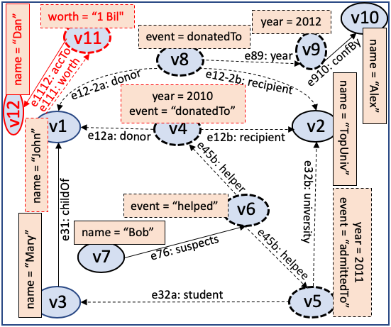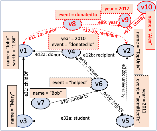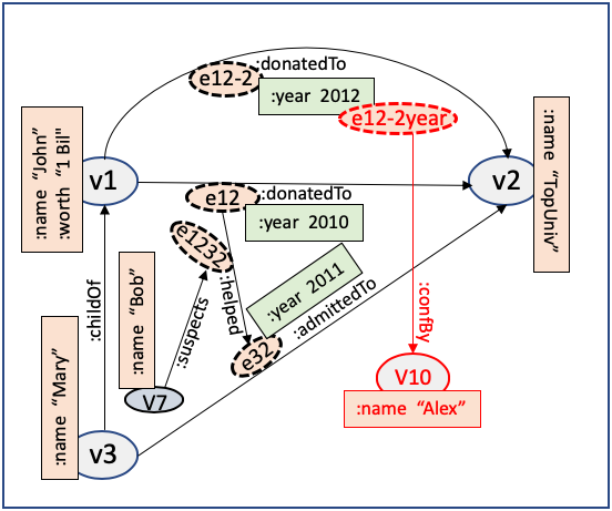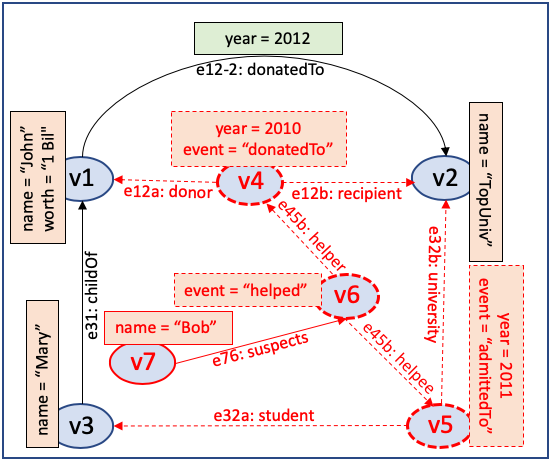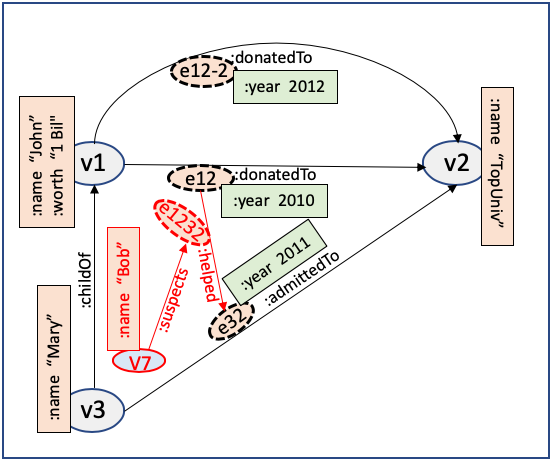 • Two new edges need to be created: a “helped” edge and a “suspects” edge. The “helped” edge would have two edges as its source and destination endpoints: the first “donatedTo” edge e12 and the “admittedTo” edge e32. The “suspects” edge would have a new “Bob” vertex as its source and the “helped” edge as its destination.
