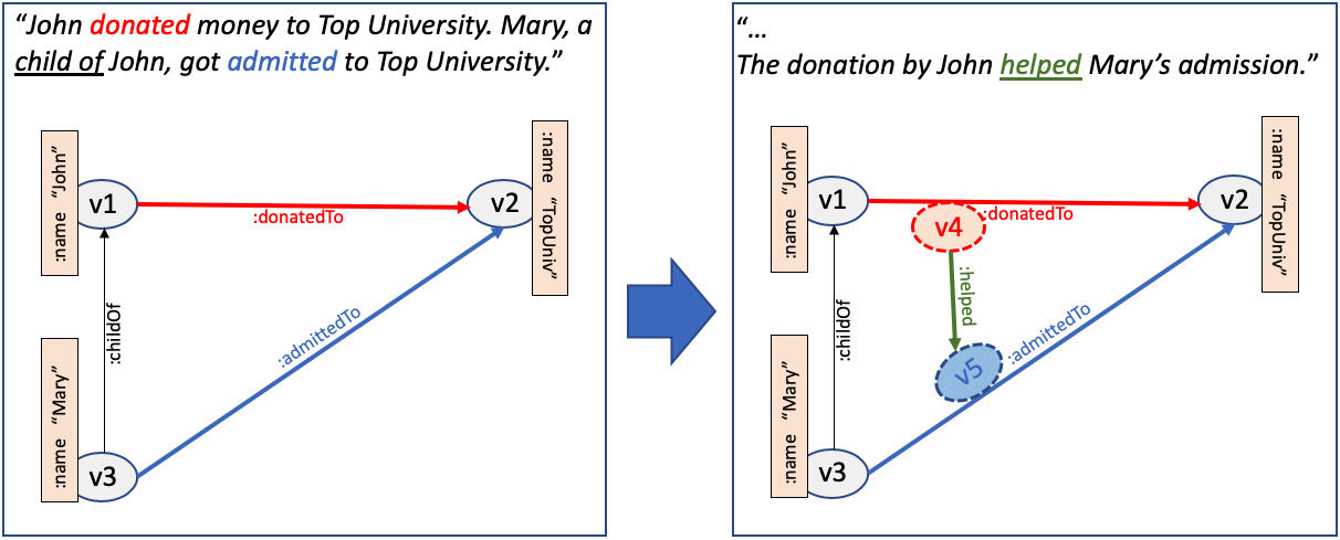 It is easy to see that a lot has changed in the schema to accommodate the small additional content. Two edge-types – “donatedTo” and “admittedTo” – have disappeared, and they have been replaced with two pairs of new edge-types <“donor” and “receiver”> and <”student” and “university”>, respectively. A new vertex-property, “event”, with value reflecting the original edge-type has been added. (In addition, a new edge-type, “helped”, has been added, but this is just an expected expansion of the original schema.)