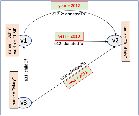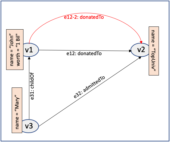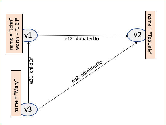 • Three vertices – v1, v2, and v3 – represent the three entities namely John, TopUniv, and Mary, respectively.