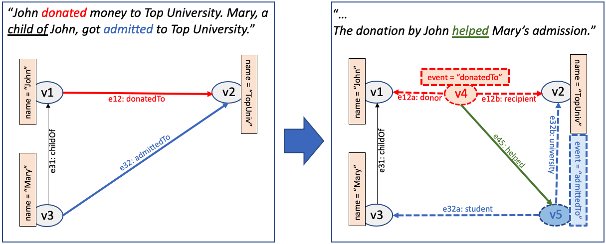 Ideally, in case of PG, adding a new edge of edge-type “helped” connecting the edge “e12: donatedTo” to the edge “e32: admittedTo”, should have been enough. Similarly, for RDF-T, a new triple connecting the “donatedTo” triple (as subject) to the “admittedTo” triple (as object) with “helped” as the predicate should have been enough.