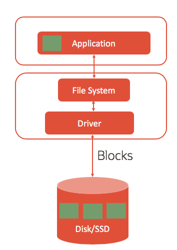 Persistent storage such as Disk and Flash SSD has always been block-oriented, and applications (such as databases) have been developed to work in this manner. Applications have traditionally been developed to read and write blocks of data in storage. Applications (or system software) handle buffering of data into memory where it is used and manipulated, then saved (or persisted) back to the storage as blocks once the application is done using it as shown in the diagram below.