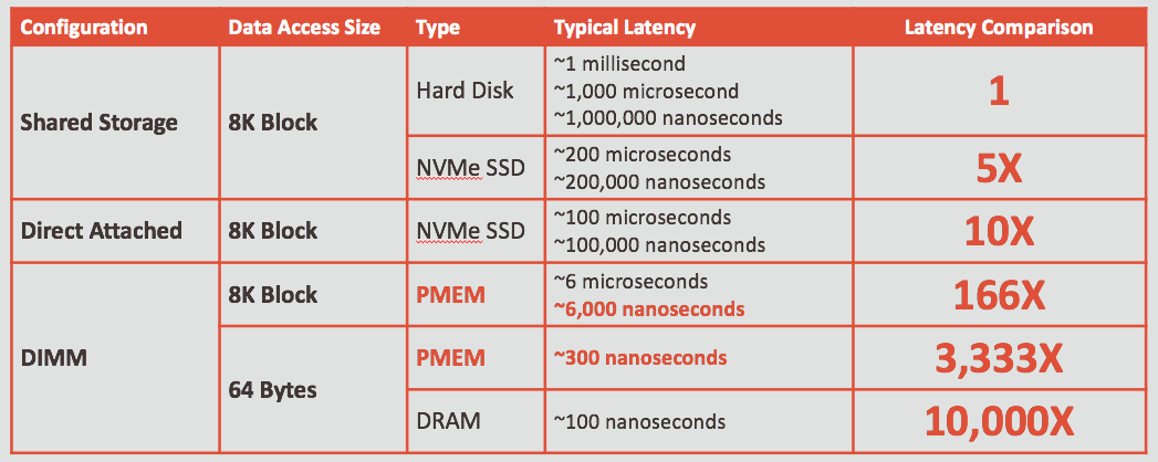 In a Flash SSD shared storage configuration delivering 200 microsecond I/O latency (0.2 milliseconds), data access is at least 5X faster than spinning disk (assuming 1 millisecond disk access time). However, Persistent Memory data access (64 bytes) at 300 nanoseconds, is more than 600 times faster than Flash SSD (such as an all-flash array).