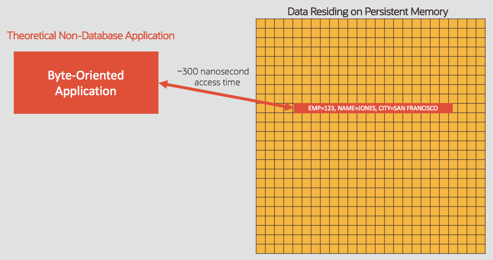 In this diagram, the entire block is being read from PMEM into DRAM, which is functionally the same as Flash SSD or spinning disk from a READ perspective. However, writing of data brings some big data integrity implications for a block-oriented application. Of course databases have traditionally been block-oriented, and this certainly applies to the Oracle database.