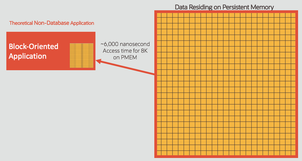 Applications that are designed for block oriented data access will copy data into memory as shown in the diagram below. Users of Persistent Memory should typically see about 6,000 nanosecond access time for 8K of data. While this is much faster than even locally attached Flash SSD, it’s not nearly as fast as DRAM or byte-oriented data access on PMEM.