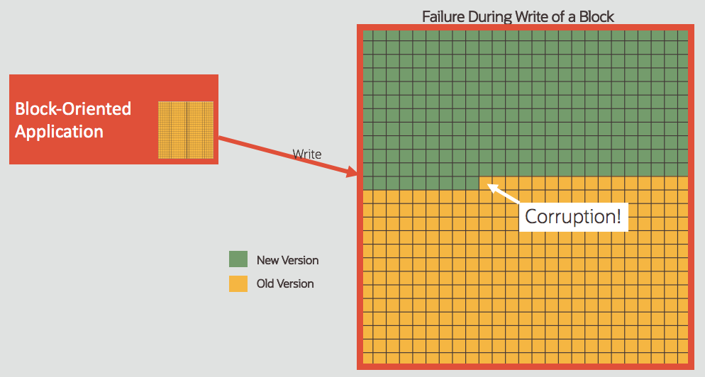 A block of data that’s partially written will typically mean data corruption for an application that is block-oriented. The application (such as a database) expects the storage to either succeed or fail the ENTIRE write operation rather than leaving it partially completed. This behavior of the storage is called “atomicity” and the granularity of atomicity is critical. Any mismatch in the size of write vs. granularity of atomicity will result in corruption. Conventional disk storage has typically gotten around this issue using a disk cache, which ensures block-level atomicity.