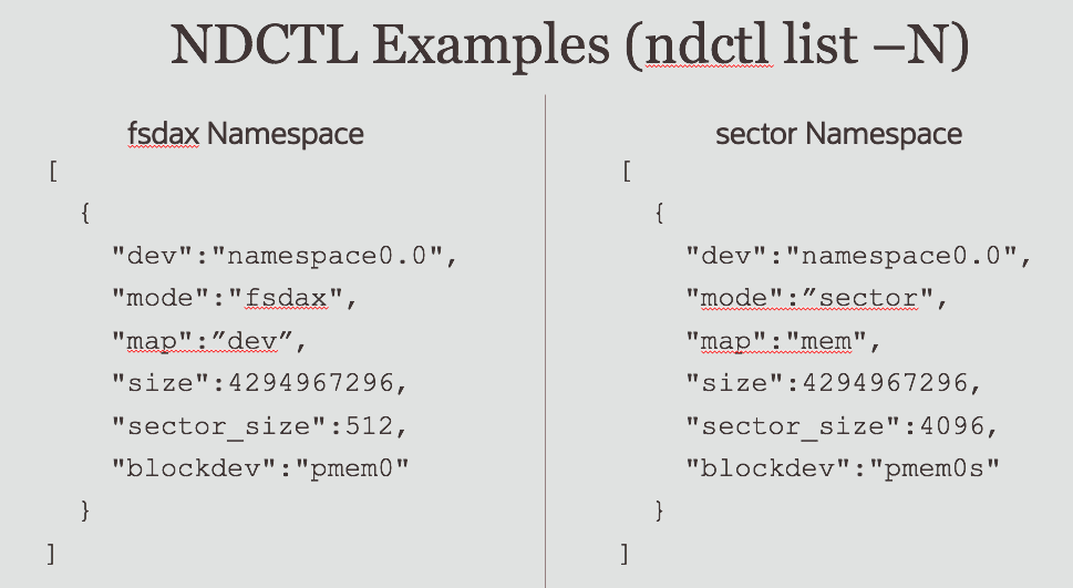 The ndctl utility is used to configure non-volatile memory devices on the Linux Platform. The command “ndctl list -N” will display a listing of configured namespaces. The following graphic shows fsdax and sector namespaces and their configuration details.