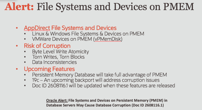 An upcoming feature of Oracle Database will take full advantage of the performance benefits of PMEM, as well as addressing the data corruption issues discussed above. In addition, an upcoming backport of changes into Oracle Database 19c will address the data corruption issues that are the subject of this MOS note. There are no known file systems, device drivers, or other solutions to this data corruption problem.