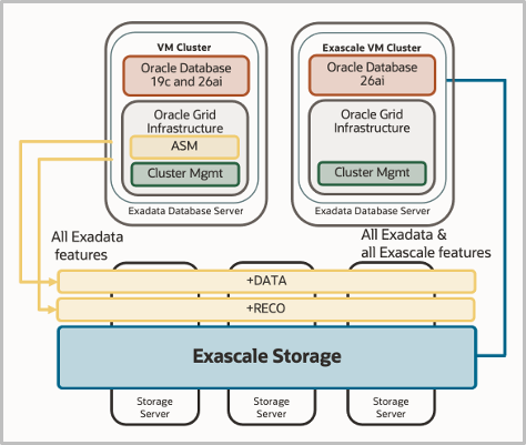 With this announcement, Exascale software can now be deployed with Exadata Database Service on Cloud@Customer and Exadata Database Service on Dedicated Infrastructure in the public cloud. Exascale software moves storage management to the storage servers, in contrast to Automatic Storage Management (ASM) running in the compute servers. Both Exascale storage and ASM can be deployed on the same infrastructure so existing databases can continue to run on ASM while databases running on Exascale storage can benefit from simplified storage management and innovations such as reimagined database clones. Both ASM and Exascale storage support Oracle Database 26ai new features such as AI Vector Search and JSON relational duality. Exascale storage can be provisioned without impacting workloads already in production.