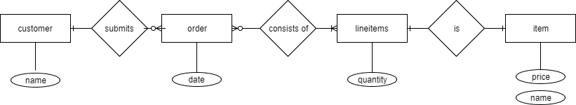 Let’s take the following as as example: an very simple model of a purchasing system. Customers can submit orders and orders consists of one or multiple items from a catalog.