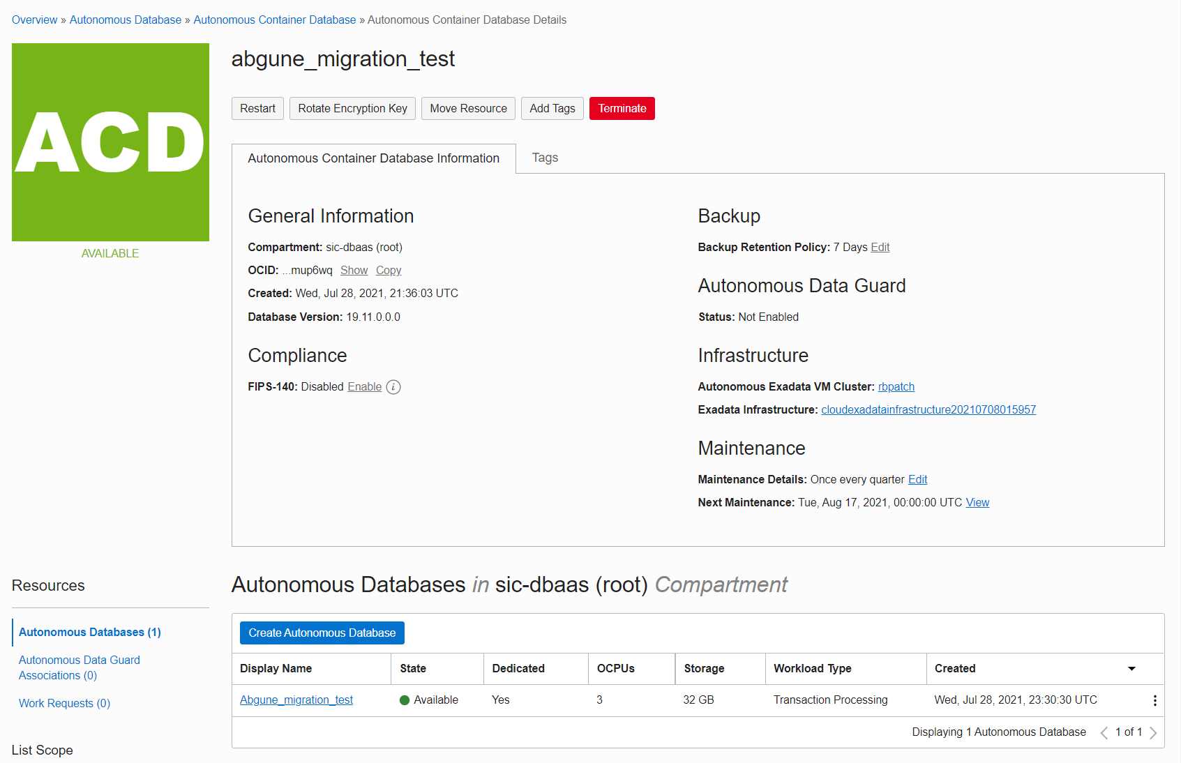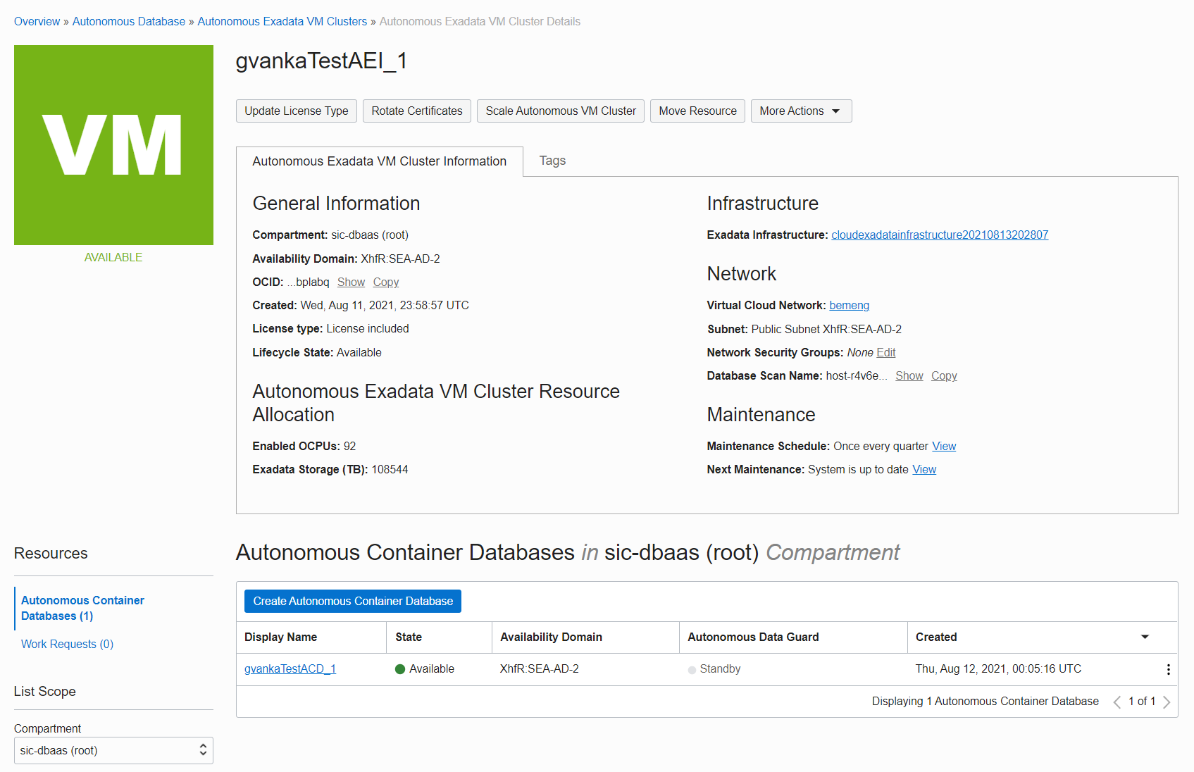 - Autonomous Container Databases will be listed on the Autonomous Exadata VM cluster details page.