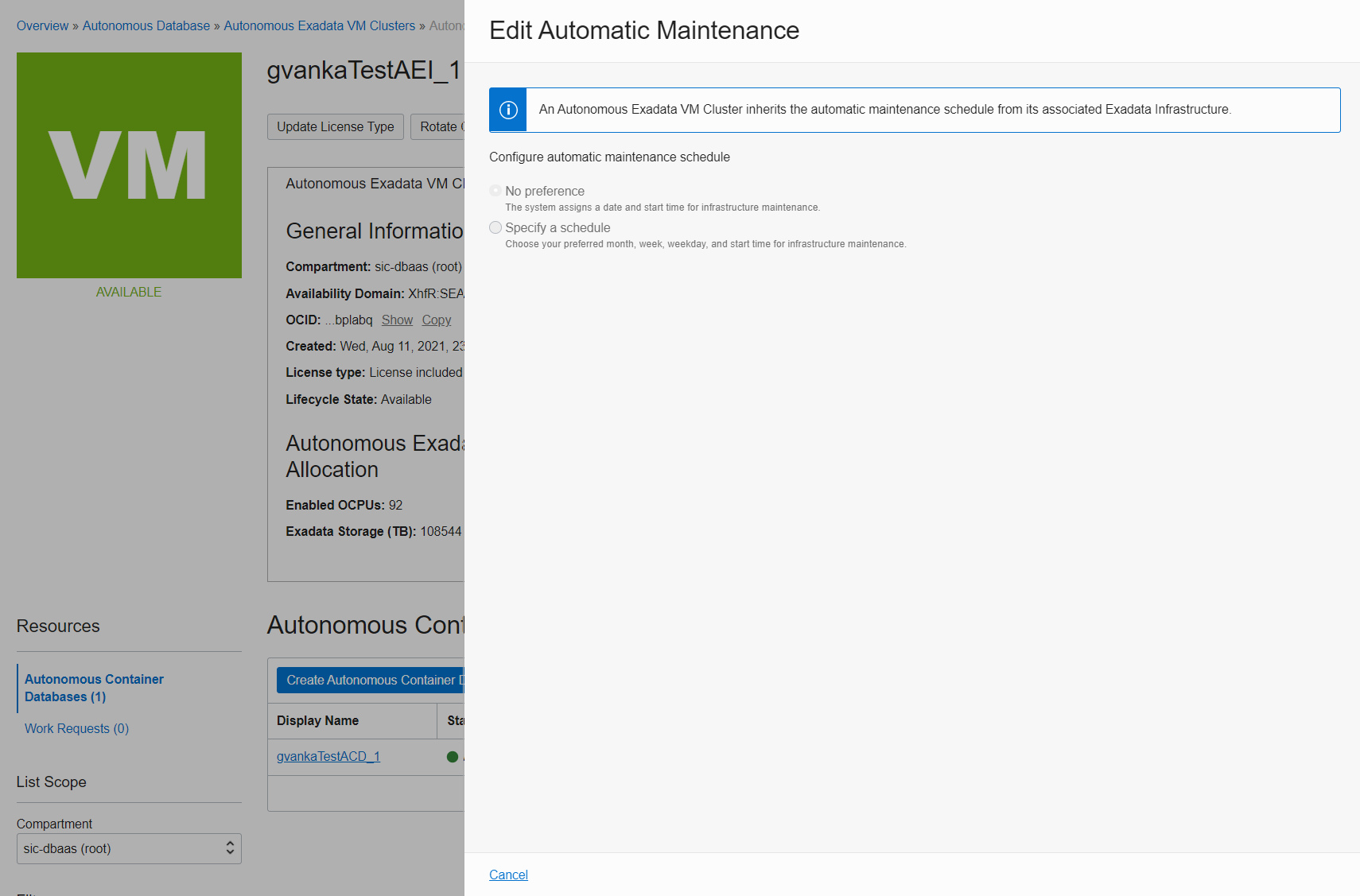 Maintenance Schedule for Autonomous Exadata VM Cluster will inherit the schedule from Exadata Infrastructure. You will not be able to edit the schedule for the Autonomous Exadata VM Cluster in this release.