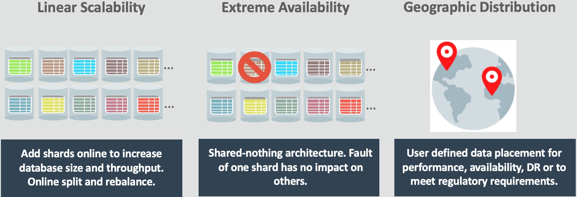 • Fault Containment. Sharding is a shared nothing hardware infrastructure that eliminates single points of failure, such as shared disk, SAN, and clusterware, and provides strong fault isolation—the failure or slow-down of one shard does not affect the performance or availability of other shards.