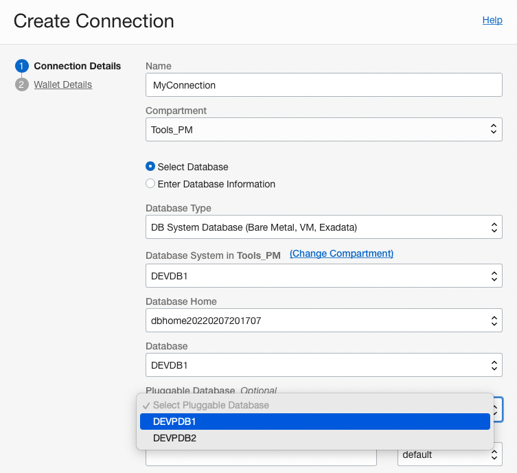 We must create one before we can utilize these database connections across OCI or development tools. Throughout this service, we aimed to aid the user as much as possible to help discover database details where ever we could. We wanted the service to be used not only by DBAs but by application developers, citizen data scientists, anyone who wants to use a database connection. One of the features added to the service to help guide users is found in the Create Connection user flow.